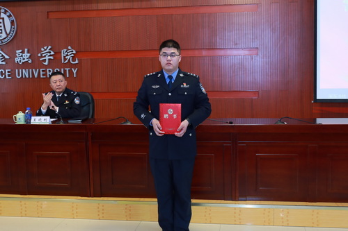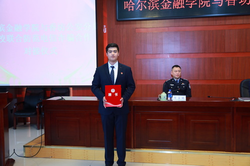 学院工会主席王忠国,向香坊公安分局警官颁发哈尔滨金融学院防诈骗协会校外指导员聘书。